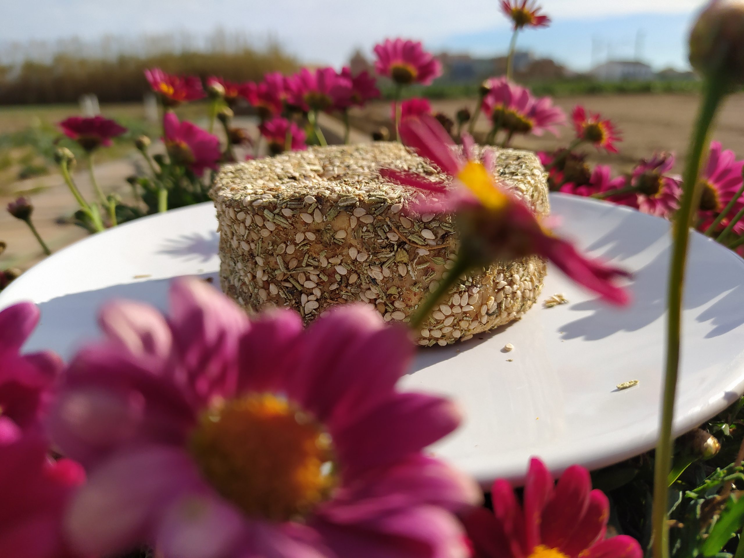 Kesano de Anacardos fermentados con Rejuvelac de Trigo Sarraceno, con setas shitake y trufa, de 4 semanas de curación.